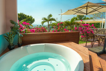 専用露天ジャグジーを完備し、オープンデッキで 竹富島とサンセットビューがお楽しみいただけるプレミアクラス。 客室スペースは40平米でゆったり、ロングスティにもオススメ。